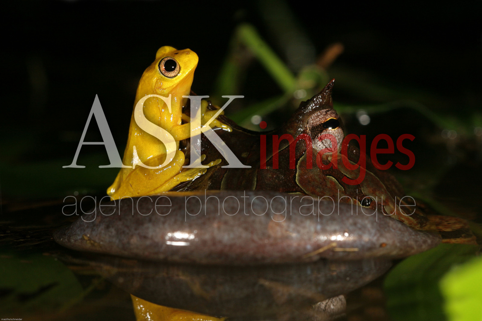 | Description | Chanteur de crapaud cornu (ceratophrys cornuta), hyla minuta cherchant a s'accoupler.... guyane |