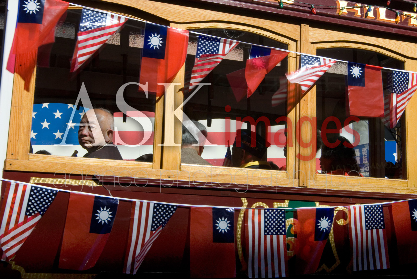 | Description | USA, San Francisco, China town. During the china day (day of taiwan independence from China) a chinese man is inside an old streetcar with american and tawainese flags. |