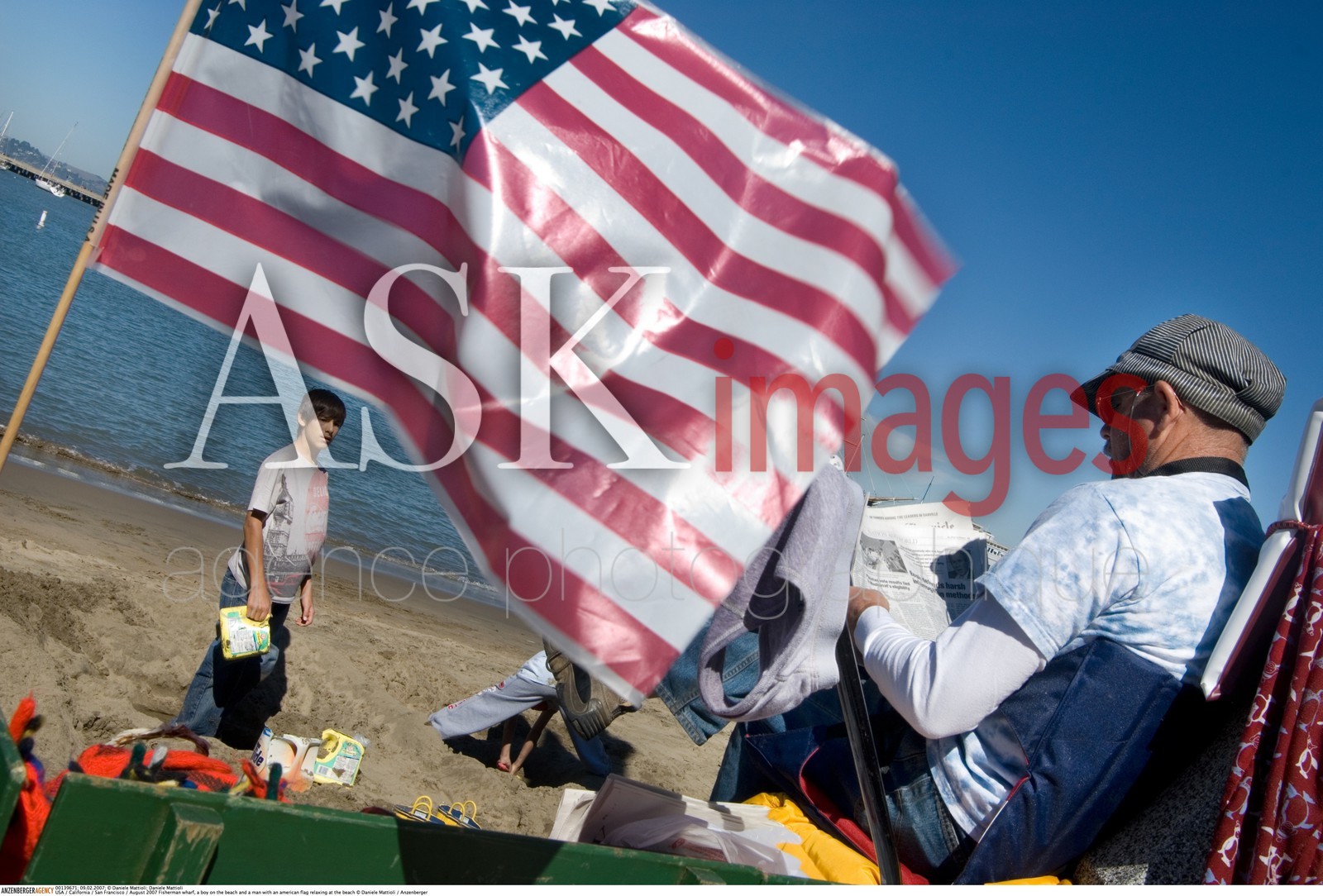 DescriptionUSA, California. San Francisco. Fisherman wharf, a boy on the beach and a man with an american flag relaxing at the beach.