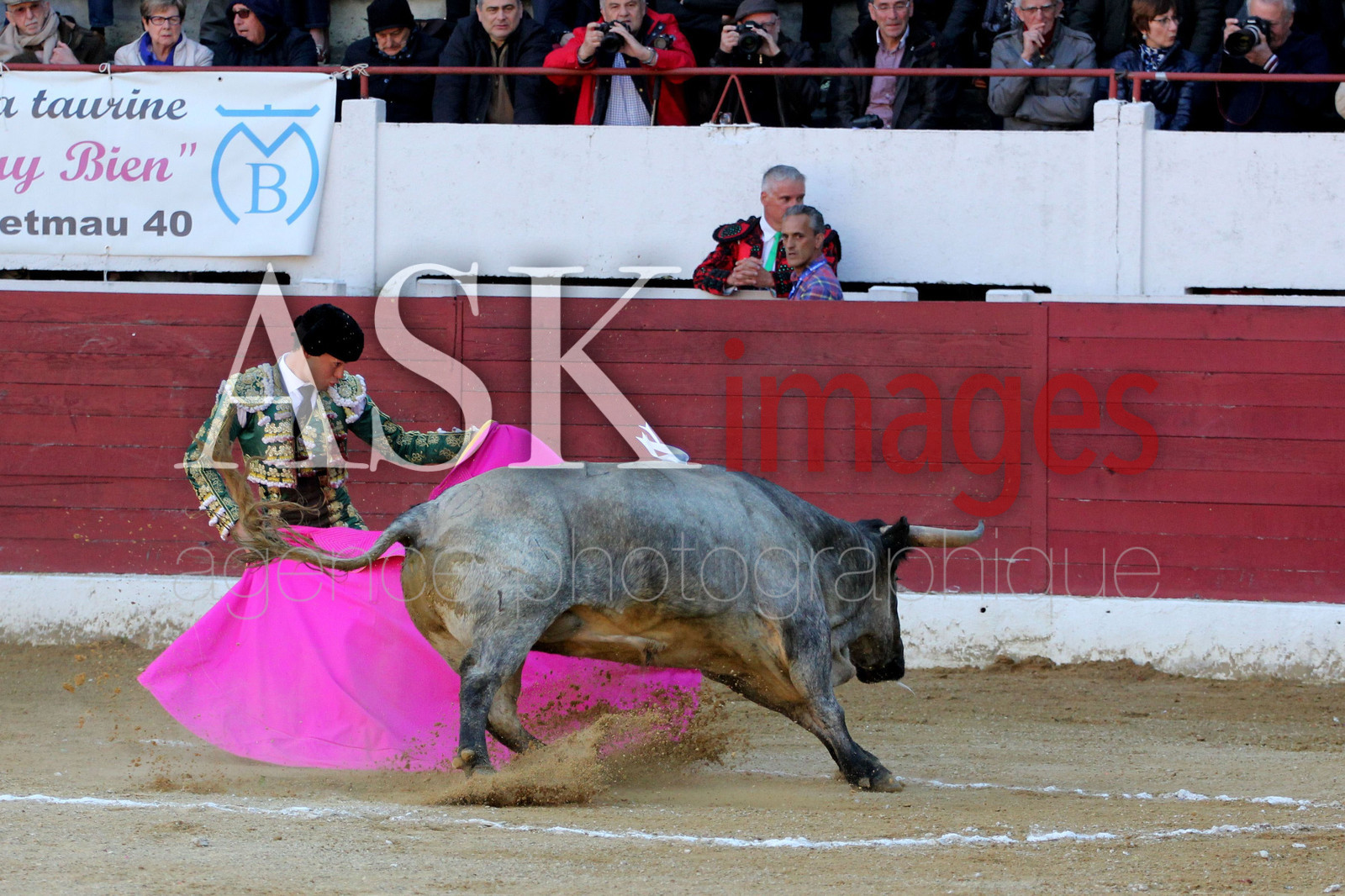 | Description | europe, france, aquitaine, landes, air sur l adour, le jeune matador, manolo vanegas pendant les novilladas de la madeleine de aire sur l adour, qui realise des passes sur un taureau de trois ans qui pese tout de meme 500 Kg, avant que les banderilleros piquent les banderilles |
