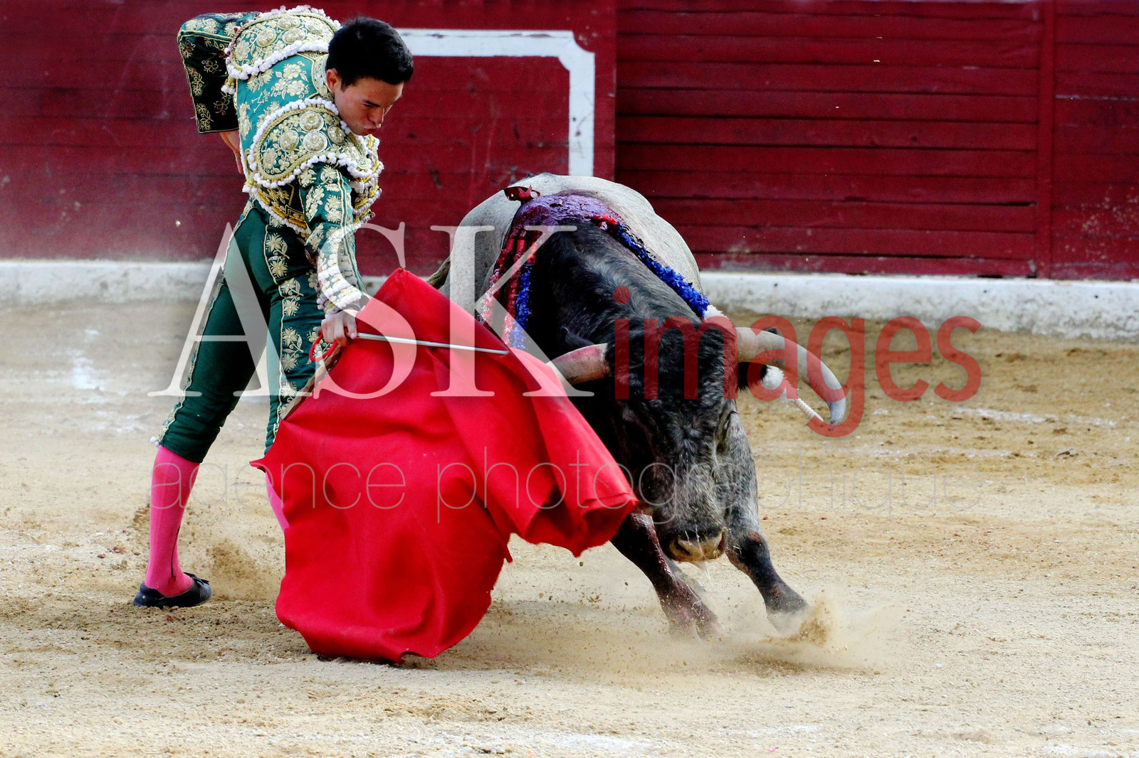 | Description | europe, france, aquitaine, landes, air sur l adour, le jeune matador, manolo vanegas pendant les novilladas de la madeleine de aire sur l adour, qui realise des passes sur un taureau de trois ans qui pese tout de meme 500 Kg, les banderilles sont planter dans le taureau |