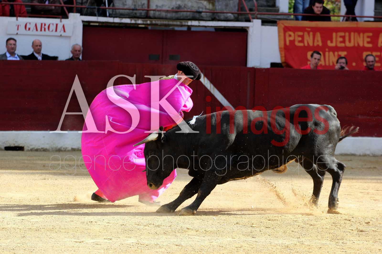 | Description | europe, france, aquitaine, landes, air sur l adour, le matador, alejandro consuero pendant les novilladas de la madeleine de aire sur l adour, qui realise des passes sur un taureau de trois ans qui pese tout de meme 500 Kg |