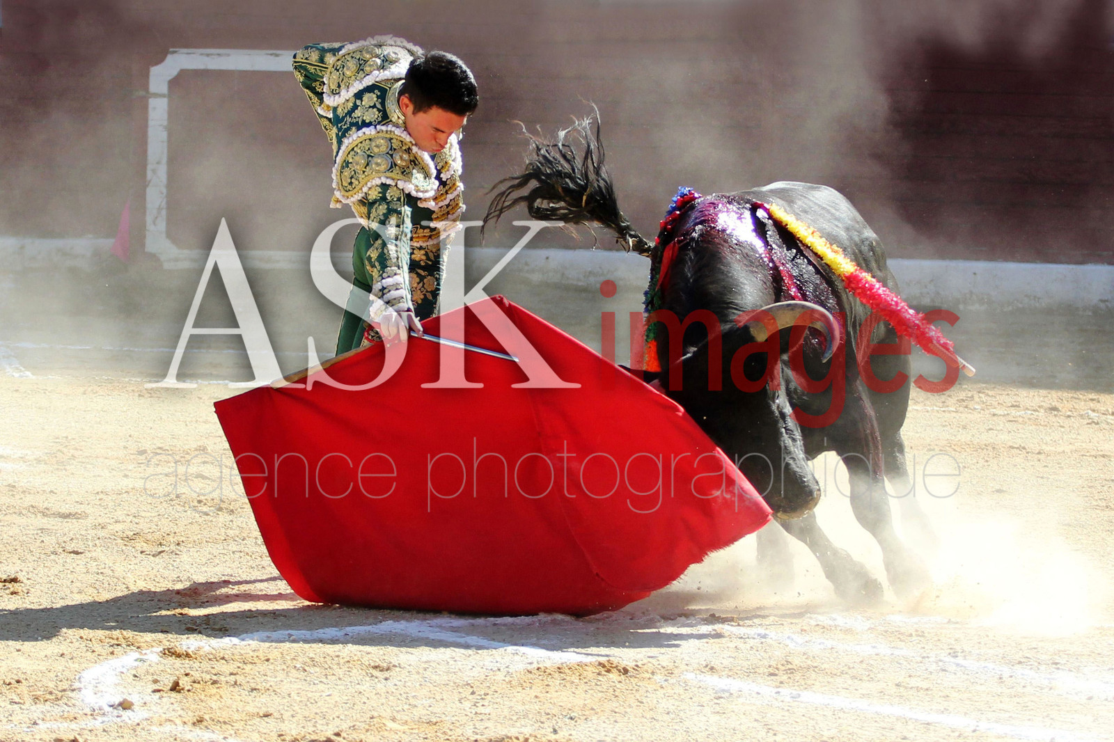 Descriptioneurope, france, aquitaine, landes, air sur l adour, le jeune matador, manolo vanegas pendant les novilladas de la madeleine de aire sur l adour, qui realise des passes sur un taureau de trois ans qui pese tout de meme 500 Kg, les banderilles sont planter dans le taureau