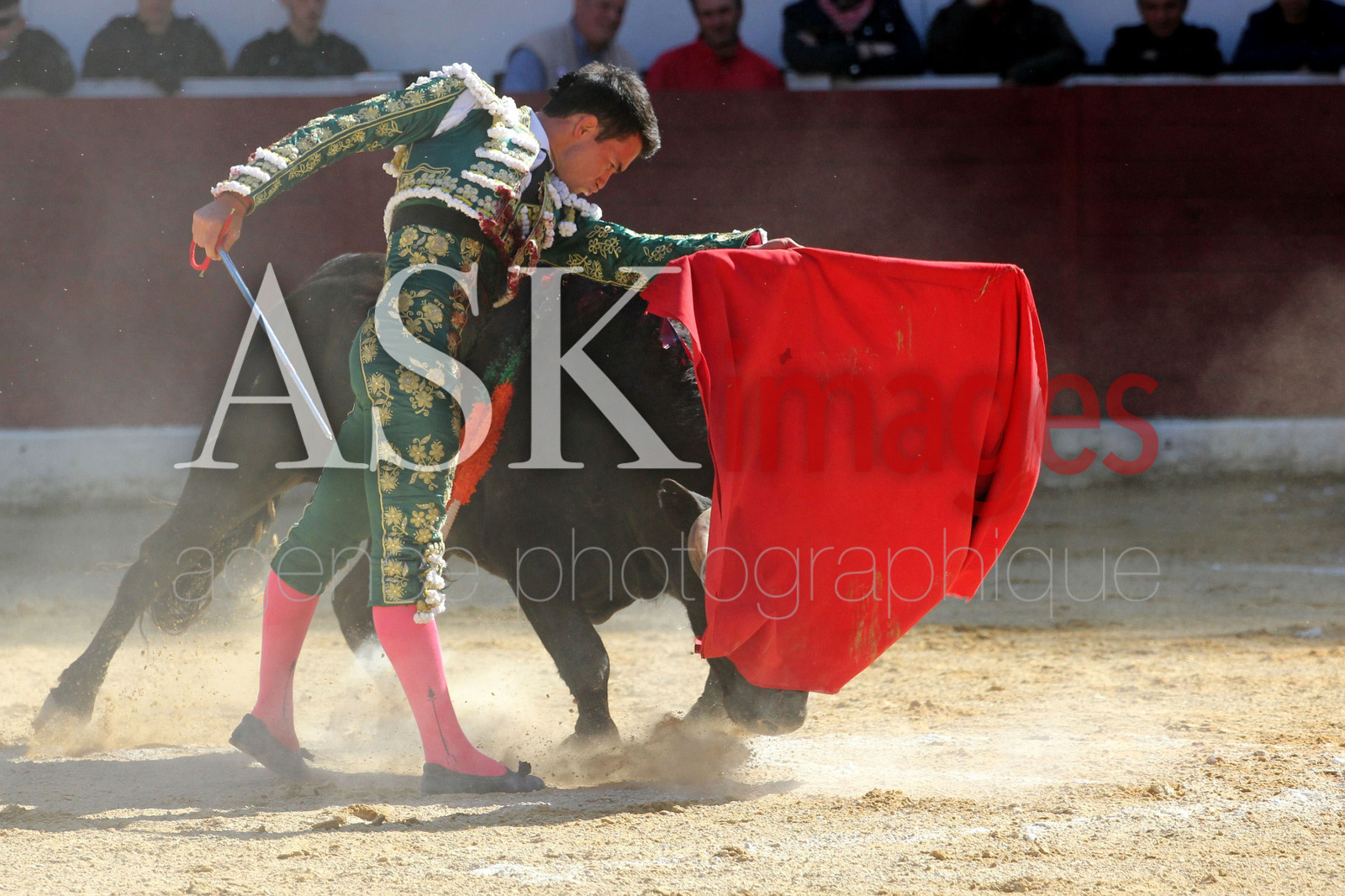 | Description | europe, france, aquitaine, landes, air sur l adour, le jeune matador, manolo vanegas pendant les novilladas de la madeleine de aire sur l adour, qui realise des passes sur un taureau de trois ans qui pese tout de meme 500 Kg, les banderilles sont planter dans le taureau |