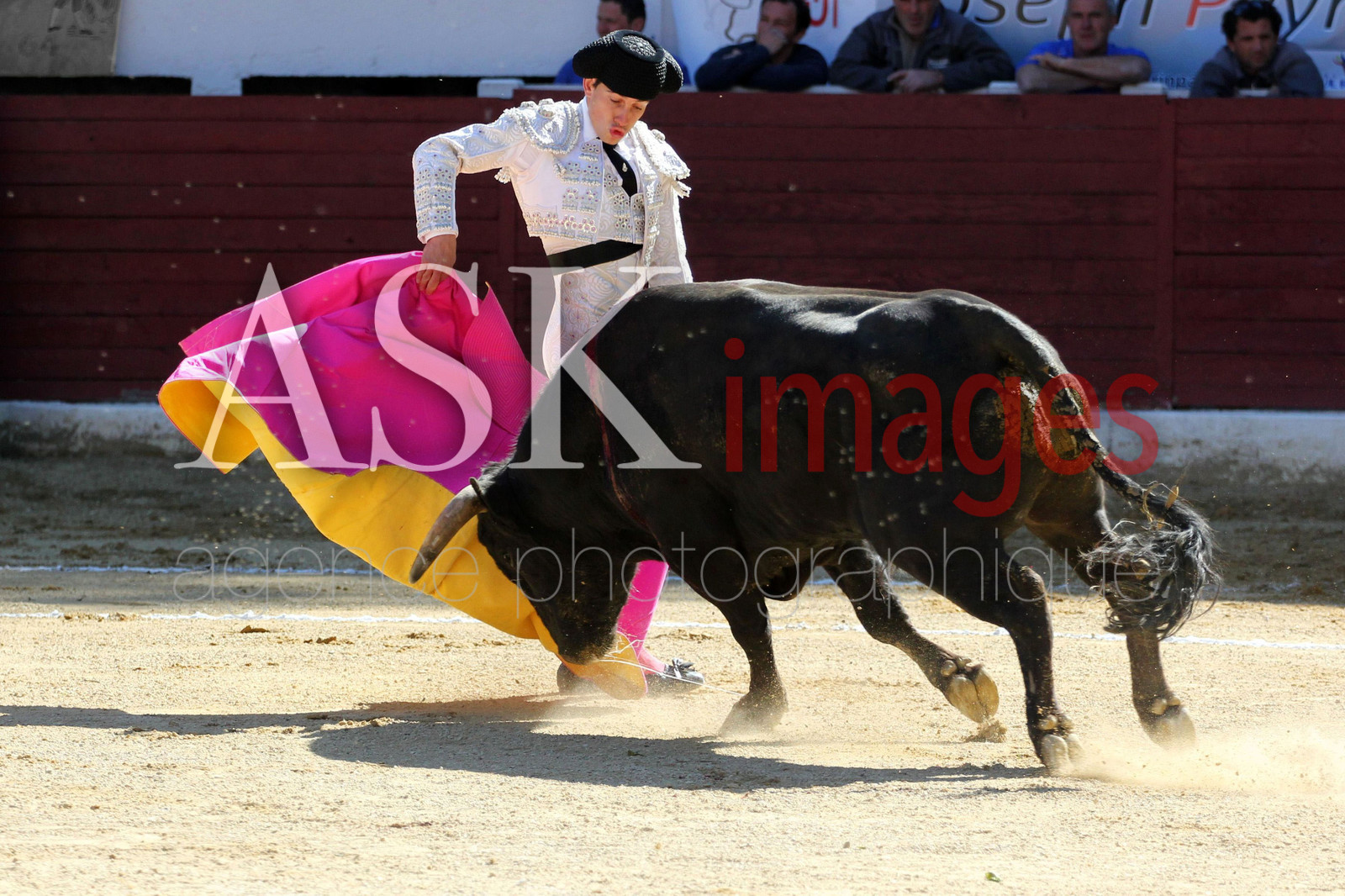 | Description | europe, france, aquitaine, landes, air sur l adour, le matador, alejandro consuero pendant les novilladas de la madeleine de aire sur l adour, qui realise des passes sur un taureau de trois ans qui pese tout de meme 500 Kg |