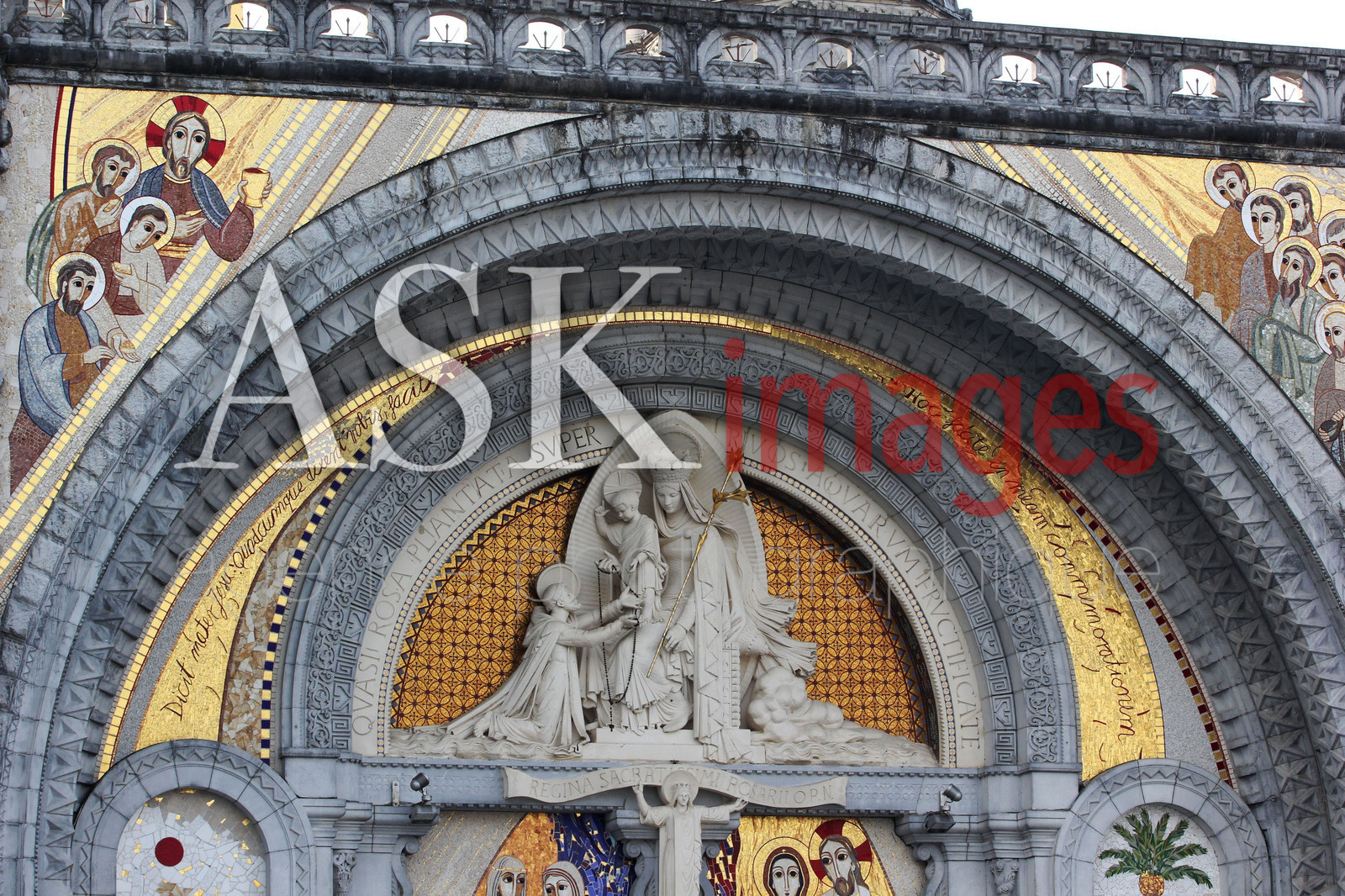 | Description | Europe, Occitanie, Hautes Pyrenees, Lourdes, detail du tympan au dessus de l'entree de la basilique Notre Dame du rosaire dite basilique inferieur car elle fait partie des trois basilique du complexe des sanctuaires de lourdes. Elle est la seconde en date de ce lieu de culte, construite de 1883 a1885 sur les plans de leopold hardy, de style romano byzantin, c est le lieu de convergence des processions. |