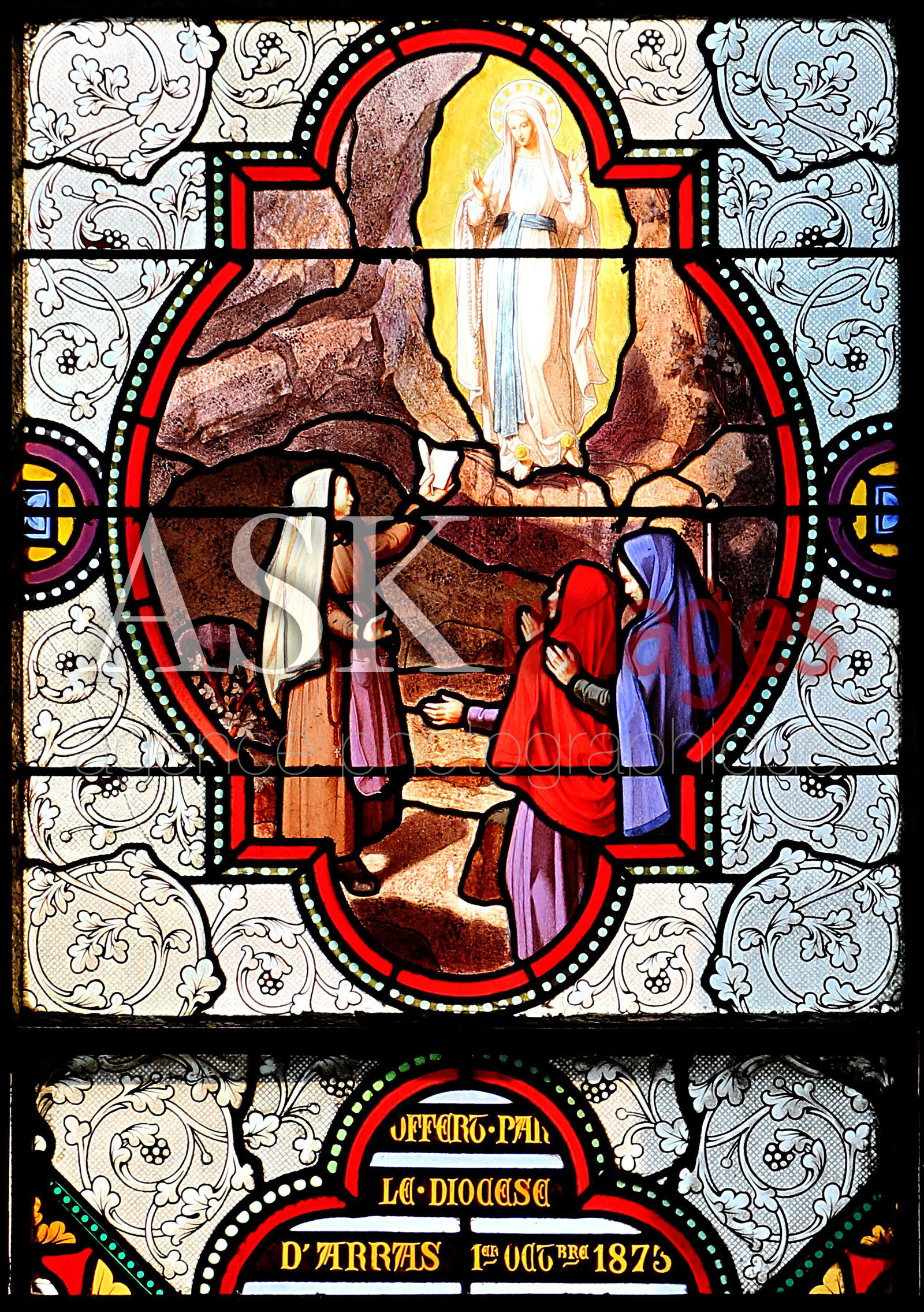 | Description | Europe, occitanie, hautes pyrenees, lourdes, basilique immaculee conception, les vitraux de la basilique retracent l histoire de la vierge marie, depuis les origines jusquía la proclamation du dogme de l immaculee conception par le pape pie IX en 1854 et les apparitions de Lourdes en 1858, Vitrail representant une scene d apparition de la Vierge a bernadette soubirous a la grotte massabielle. |