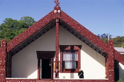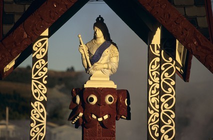 • Sculpture at the entrance of the Maori Art Institut, Whaharoa, Rotorua, North Island, New Zealand.