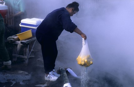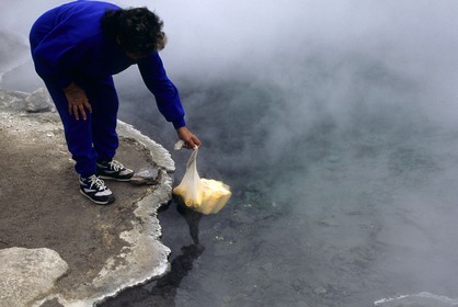 • A Maori woman is cooking in hot spring, Whakarewarewa, Rotorua; North Island, New Zealand.