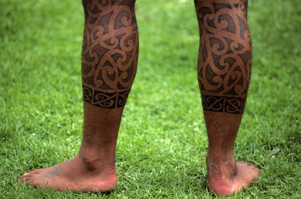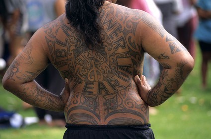 • Tattoo in the back of a Maori man, Aotearoa, North Island, New Zealand.