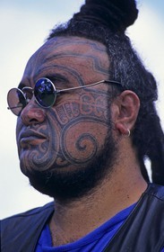 • Portrait of a Maori warrior with tattoo. New Moko, North Island, New Zealand.