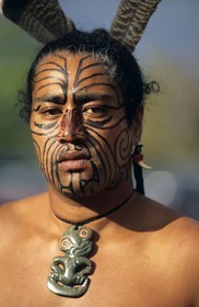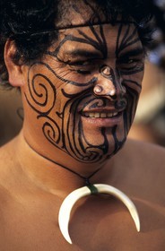 • Portrait of a Maori dancer from Arawa tribe, Rotorua, North Island, New Zealand.