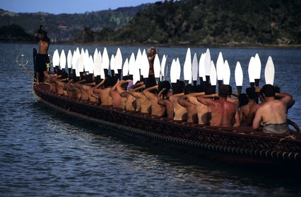• Maori men learning how to drive a waka (Maori pirogue). Waitangi Day, North Island, New Zealand.
