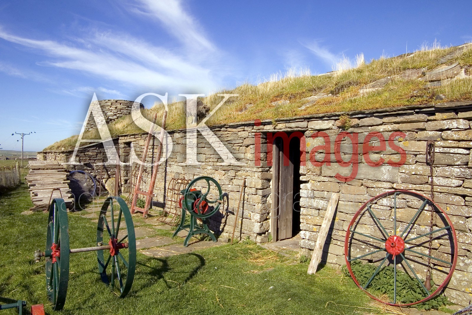 | Description | Corrigall Orkney Scotland North Ronaldsay Sheep Eating Turf Roof at Farm Museum. |