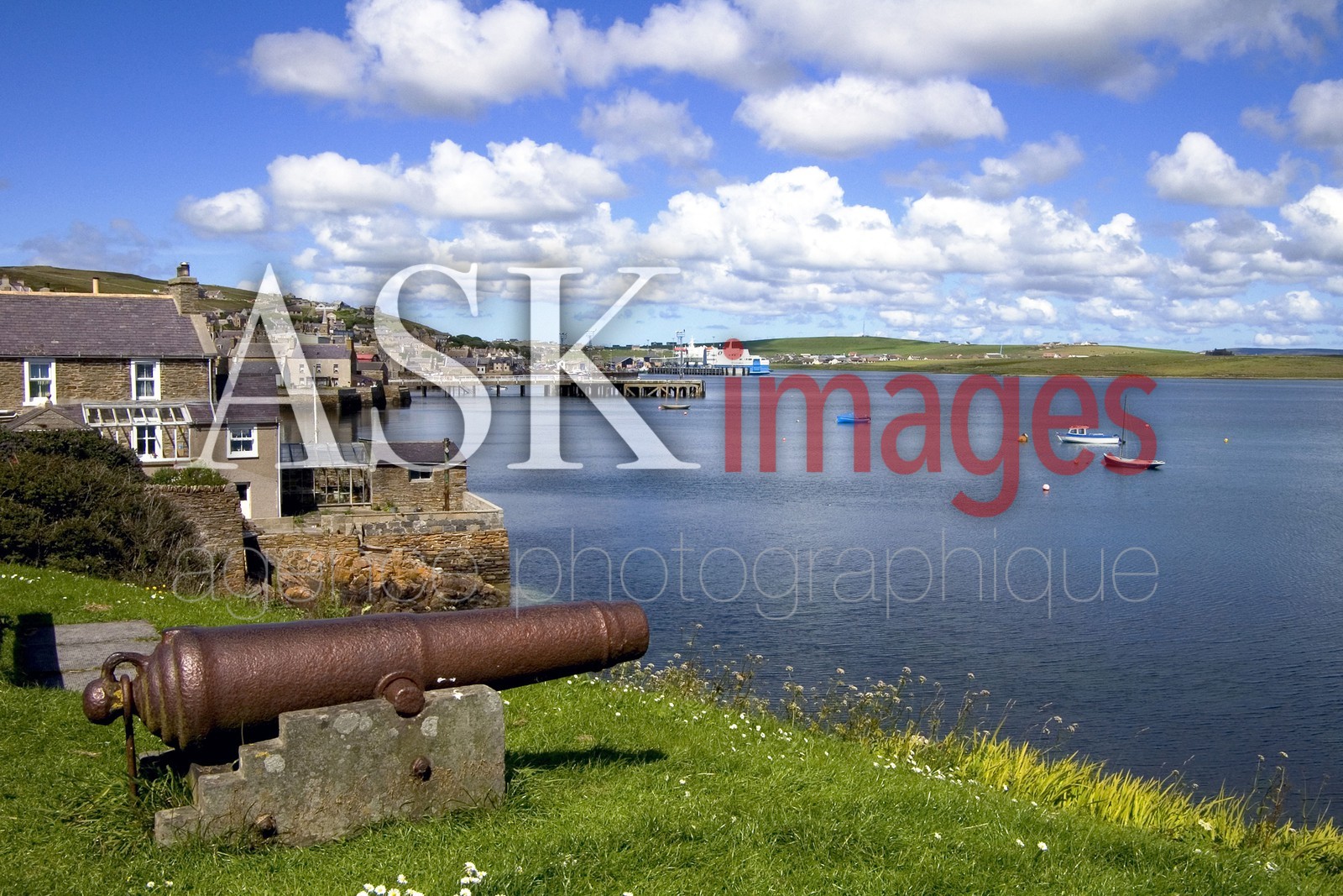 | Description | Stromness Orkney Scotland Cannon Gun Overlooking Hamnavoe Harbour Houses and Boats. |