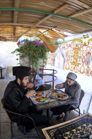 Hassidim in a sukka during sukkot holiday in the vegetarian restaurant Garden of the green, Jerusalem