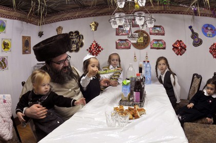 Hassidim in a sukka during sukkot holiday in Mea Shearim, Jerusalem.