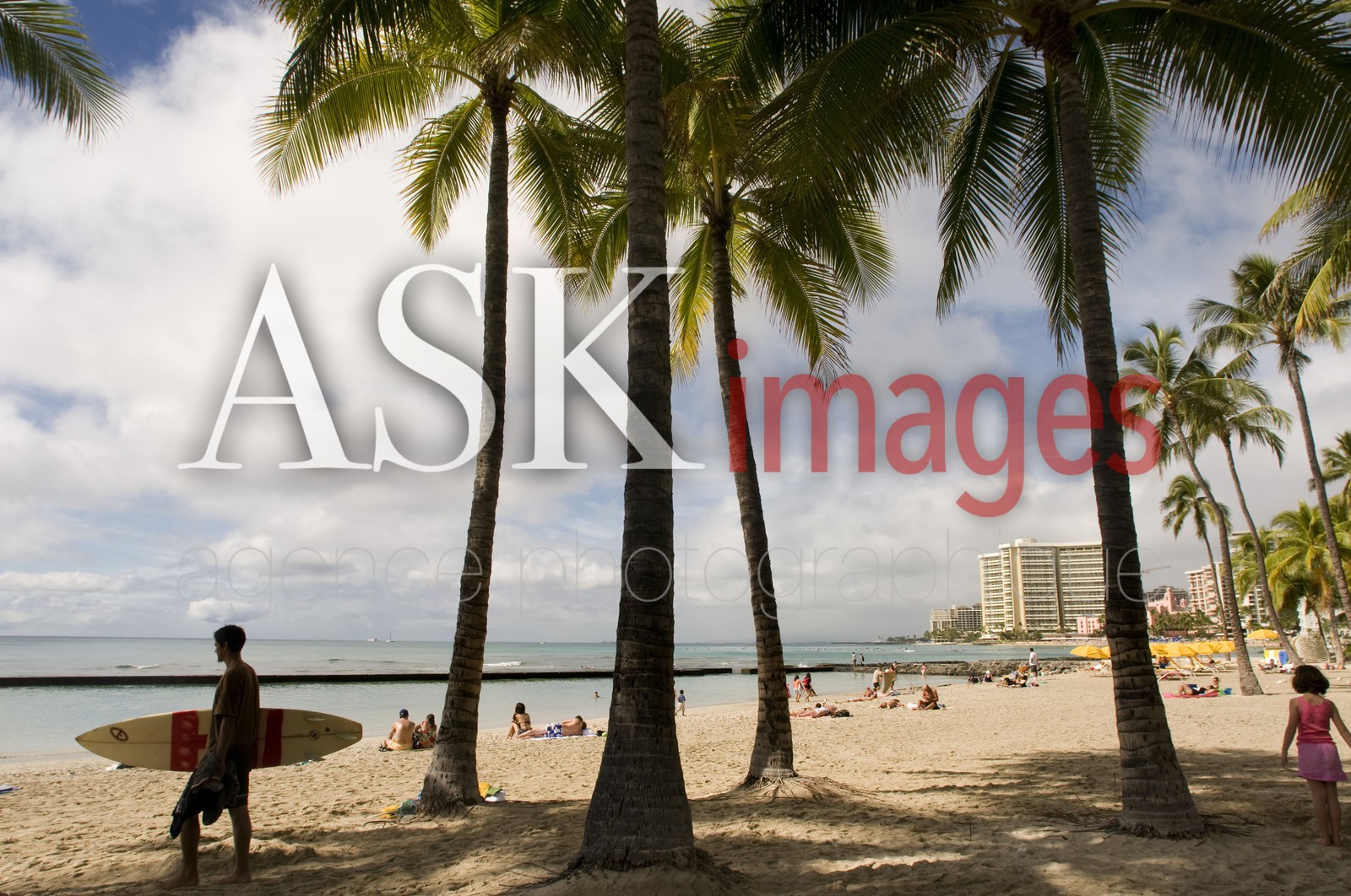 | Description | Surfer on the famous Waikiki Beach. Kalakaua Avenue. O'ahu. Hawaii. Located on the south shore of Honolulu, the world-famous neighborhood of Waikiki was once a playground for Hawaiian royalty. Known in Hawaiian as "spouting waters," Waikiki was introduced to the world when its first hotel, the Moana Surfrider, was built on its shores in 1901. |