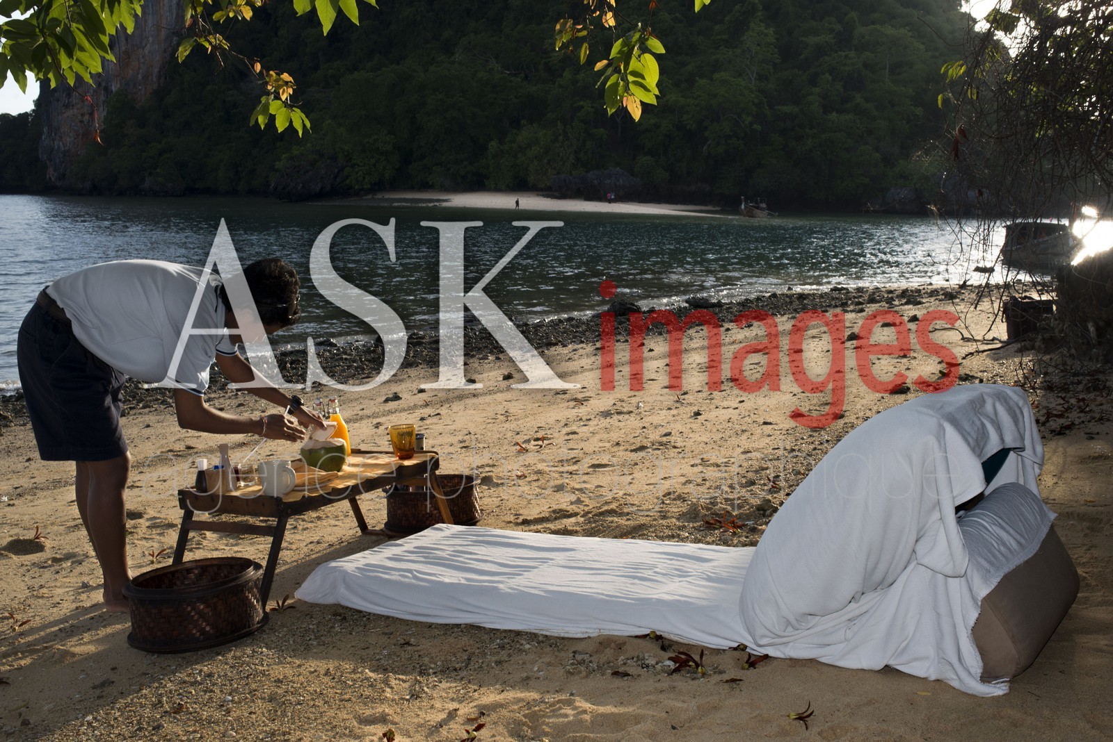 DescriptionSix Senses Resort, Koh Yao Noi, Phang Nga Bay, Thailand, Asia. Waitress preparing a sunrise Picnic breakfast on a deserted Island in Koh Hong archipelago.