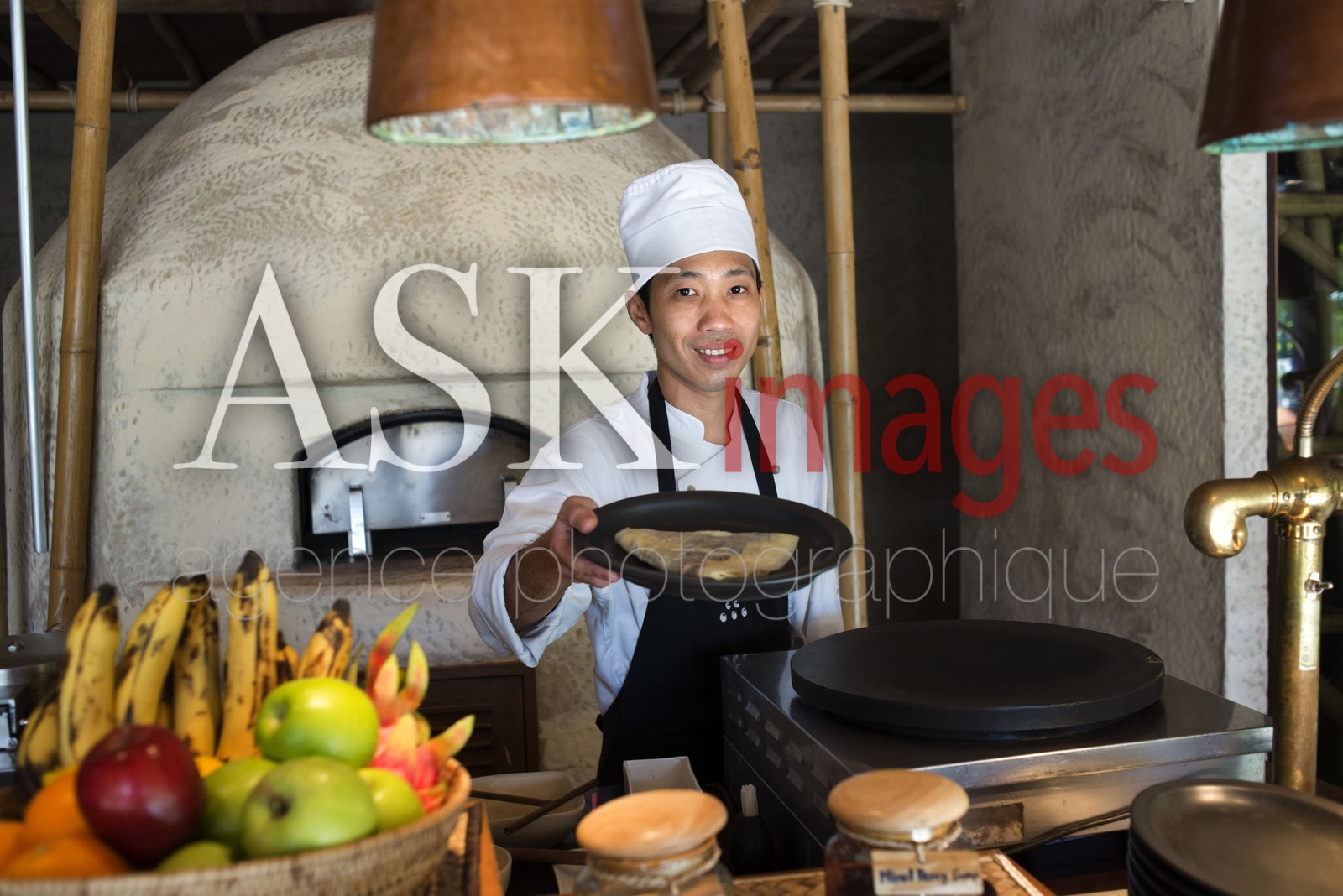 | Description | Six Senses Resort, Koh Yao Noi, Phang Nga Bay, Thailand, Asia. Waiter with a pancake in a breakfast time. |