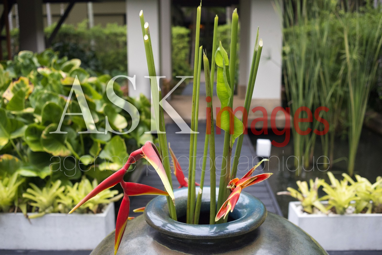 | Description | Vase with flowers in the garden in the spa of Anantara Si Kao Resort & Spa, south of Krabi, Thailand. |