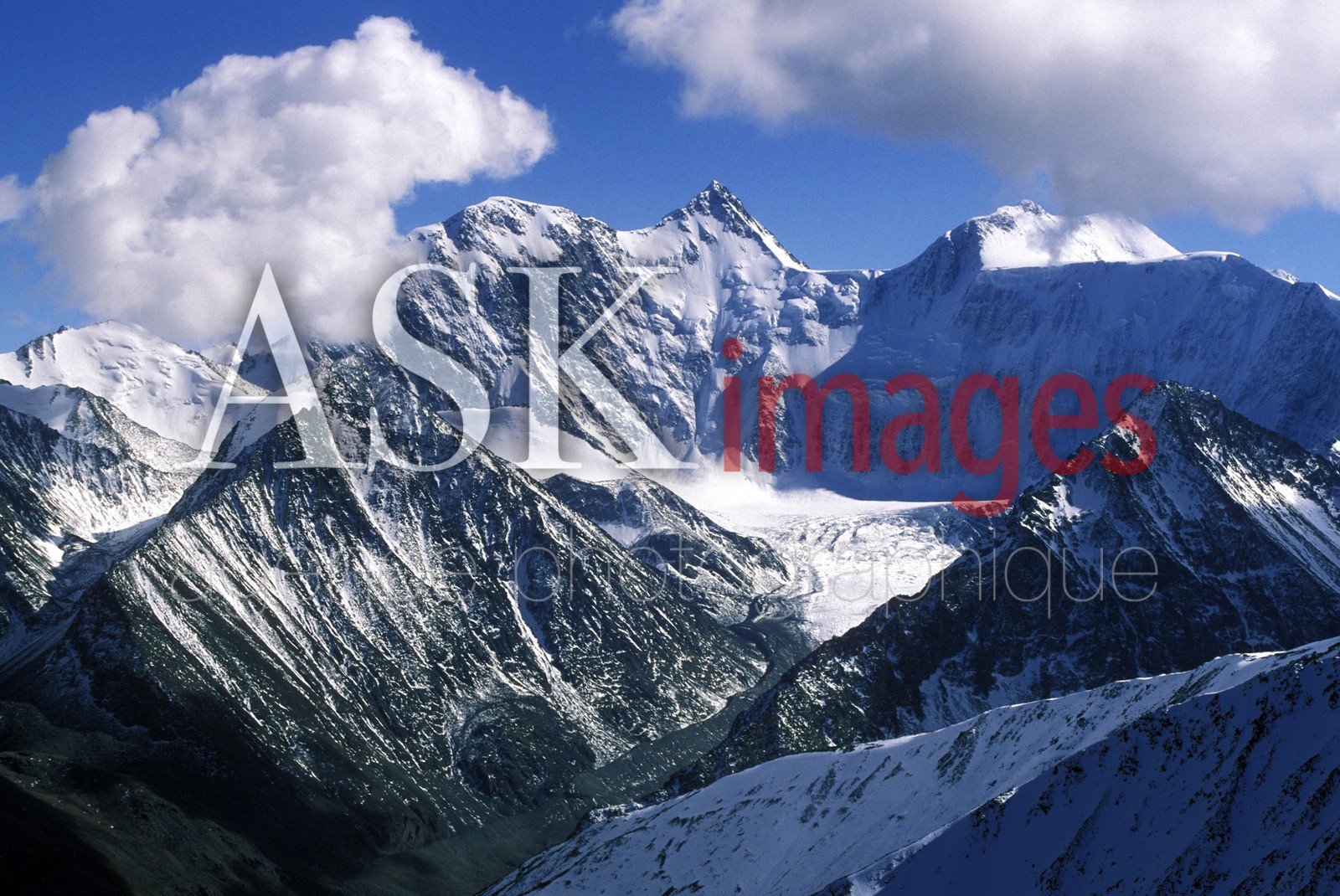 DescriptionAltai Mountains, Katunskiy Ridge with panorama on Mt.Belukha (4506m), the highest in Siberia, with many peaks and glaciers, end of September, Russia