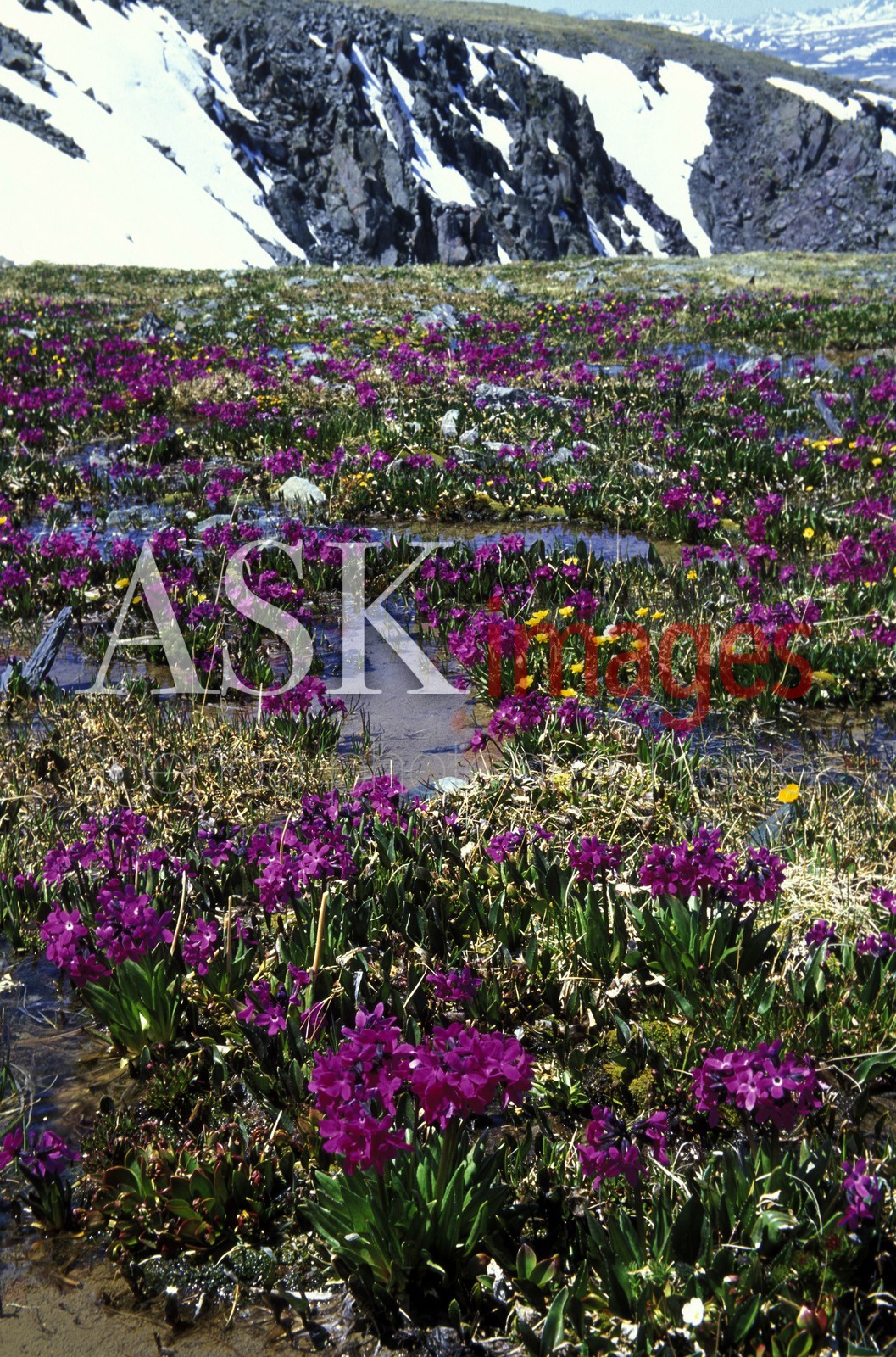 | Description | Alpine meadows with Snow Primrose (Primula nivalis) in Altai Region, June, Russia |